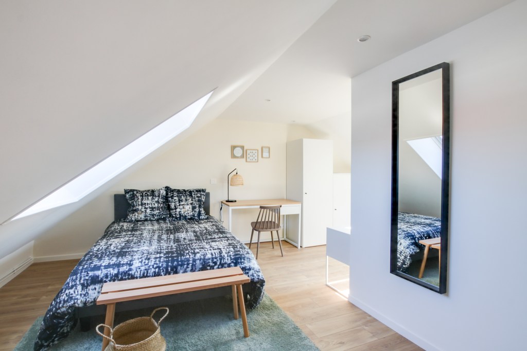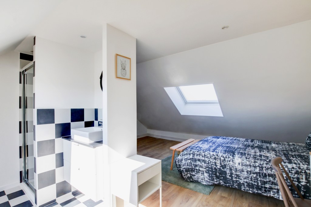 Objectifs : Attribuer des parties communes au logement et créer une salle de bain à l’étage pour une chambre esprit suite d’hôtel.